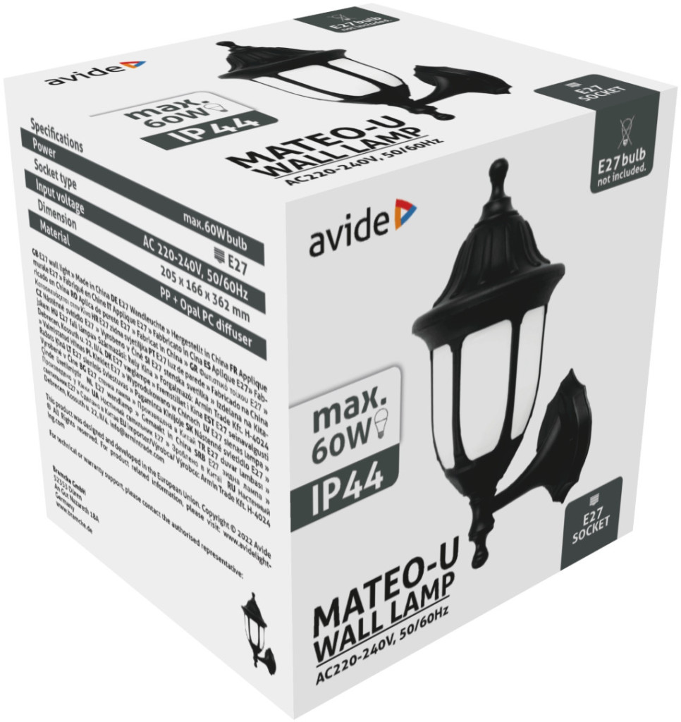 Avide Kültéri Fali Lámpa Mateo-U 1xE27 Fekete IP44