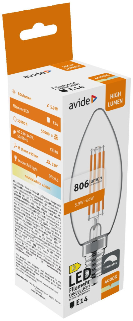 Avide LED Filament Candle 5.9W E14 NW 4000K Fényerőszabályozható