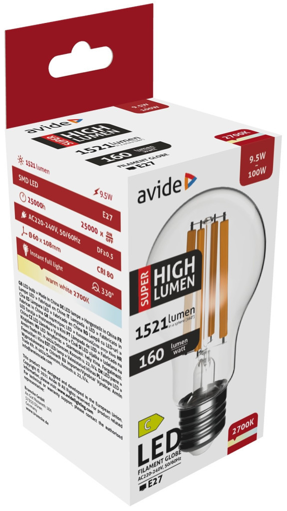 Avide LED Filament Globe 9.5W E27 A60 WW 2700K Super High Lumen