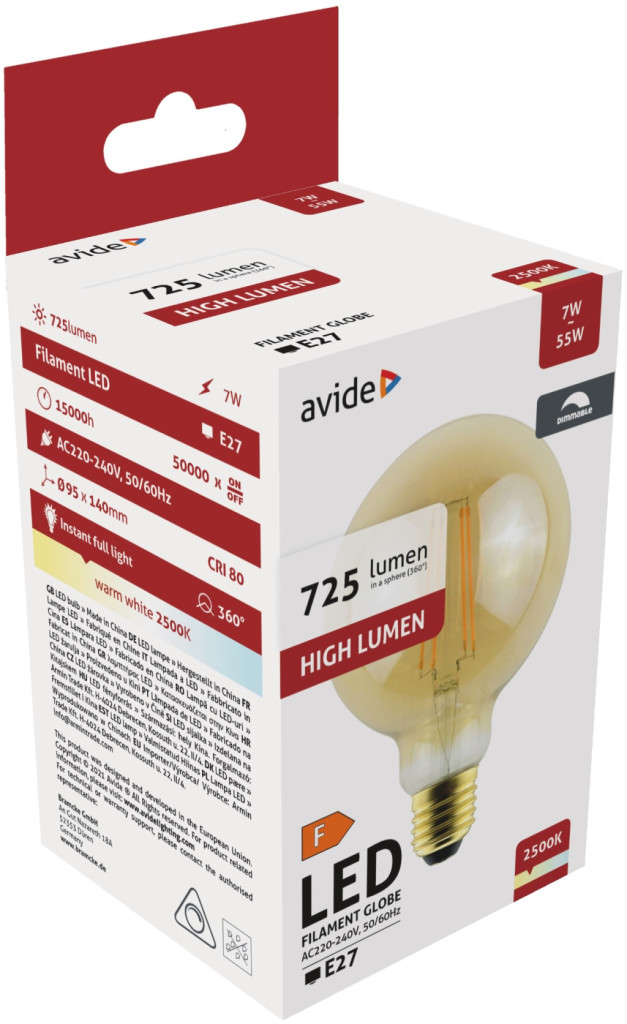Avide LED Filament Globe G95 7W Fényerőszabályzós Borostyán E27 WW 2500K