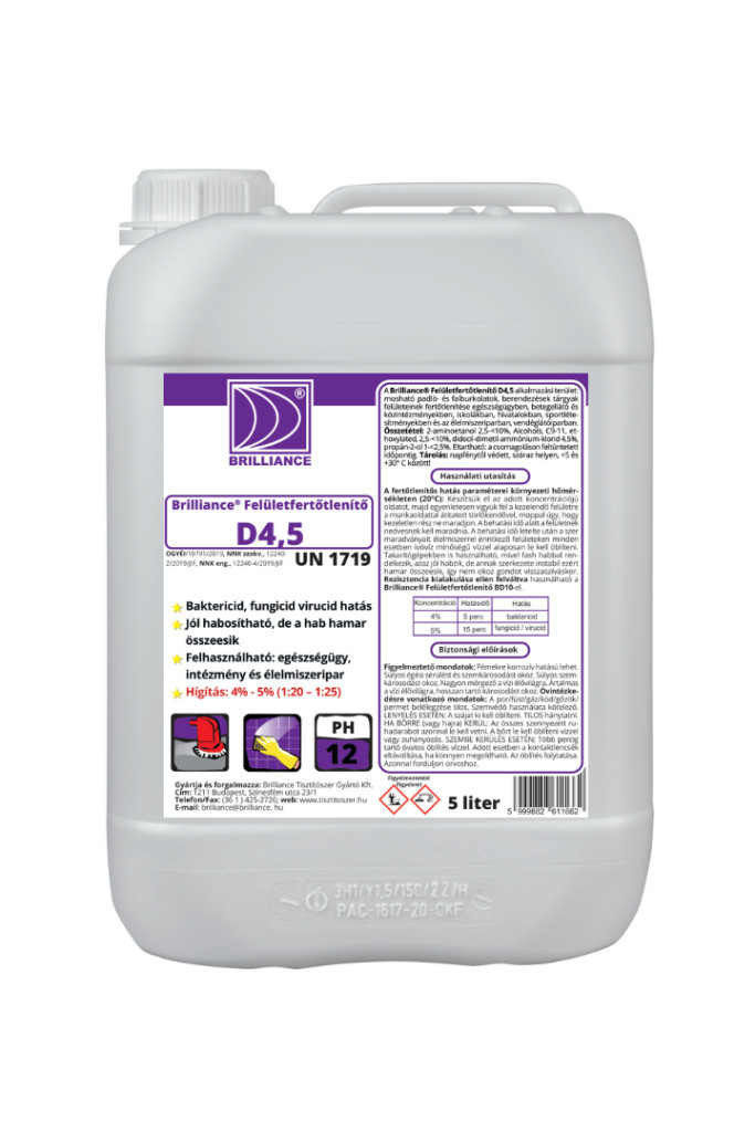 A Brilliance® Felületfertőtlenítő D4,5 alkalmazási terület: mosható padló- és falburkolatok, berendezések tárgyak felületeinek fertőtlenítése egészségügyben, betegellátó és közintézményekben, iskolákban, hivatalokban, sportlétesítményekben és az élelmiszeriparban, vendéglátóiparban. A fertőtlenítő hatás paraméterei környezeti hőmérsékleten (20 °C):Készítsük el az adott koncentrációjú oldatot, majd egyenletesen vigyük fel a kezelendő felületre a munkaoldattal átitatott törlőkendővel, moppal úgy, hogy kezeletlen rész ne maradjon. A behatási idő alatt a felületnek nedvesnek kell maradnia. A behatási idő letelte után a szer maradványait élelmiszerrel érintkező felületeken minden esetben ivóvíz minőségű vízzel alaposan le kell öblíteni. Takarítógépekben is használható, mivel fash habbal rendelkezik, azaz jól habzik, de annak szerkezete instabil ezért hamar összeesik, így nem okoz gondot visszaszíváskor. Rezisztencia kialakulása ellen felváltva használható a Brilliance® Felületfertőtlenítő BD10-el.
