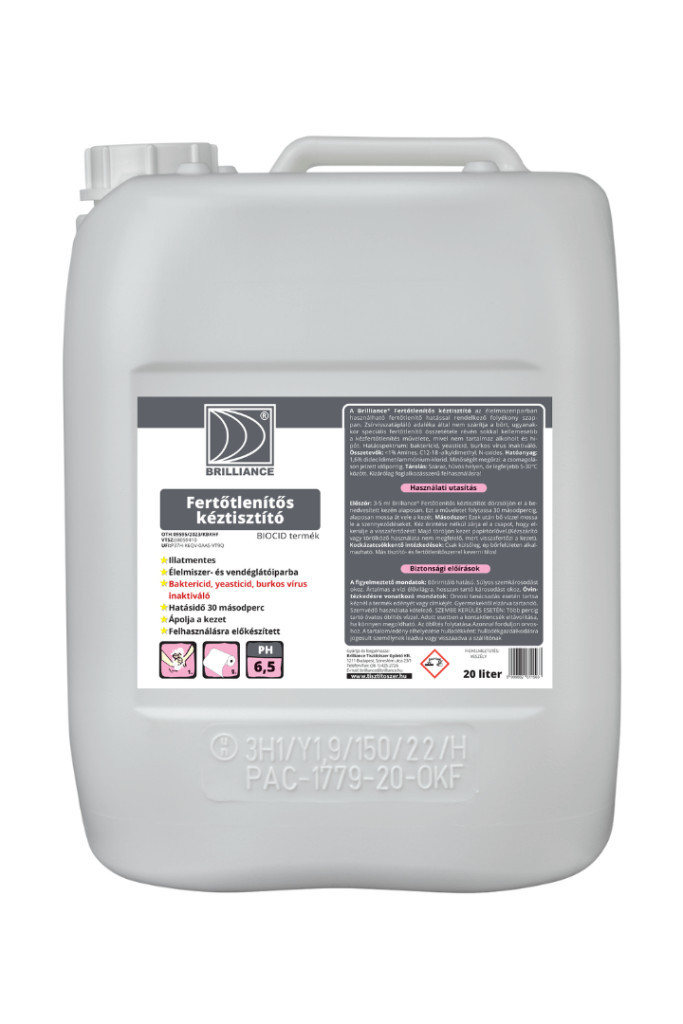 A Brilliance® Fertőtlenítős kéztisztító az élelmiszeriparban használható fertőtlenítő hatással rendelkező folyékony szappan. Zsírvisszatápláló adaléka által nem szárítja a bőrt, ugyanakkor speciális fertőtlenítő összetétele révén sokkal kellemesebb a kézfertőtlenítés művelete, mivel nem tartalmaz alkoholt és hipót. Hatásspektrum: baktericid (MRSA), yeasticid, burkos vírus inaktiváló 30 másodperc alatt.