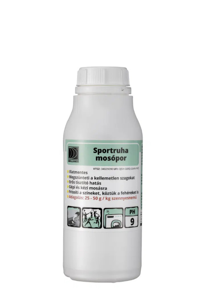 A Brilliance® Sportruha mosópor egy teljesen új megközelítést alkalmaz a kellemetlen testszag sportruhából való eltávolítására. Tesztekkel bizonyítottuk, hogy akár egy napokig berohadt, izzadságszagú ruha is könnyen kimosható az Brilliance® Sportruha mosópor forradalmian új, mélytisztításának és szagtalanításának köszönhetően. Mindegy, hogy erős vagy brutális edzést végzel ruháid innentől kezdve nem lesznek kellemetlen szagúak. A Brilliance® Sportruha mosópor a szagok eredetével küzd meg, gyökerestül orvosolva a problémát, azonban a szövetet nem roncsolja, így ruháidat sokáig tudod használni. Az erős tisztító hatása mellett a színes és fehér ruhák színeit egyaránt frissíti.Gépi mosásnál: Szennyezettségtől függően 25 - 50 g / Kg szennyes nemű az adagolása 40 °C-on az első fázisban. A tökéletes végeredmény érdekében, a második fázisban használja a Brilliance® ÖKO Textilfrissítőt, melyet a mosógépbe, az öblítő helyére töltsön.Kézi mosásnál: Erősen szennyezett büdös sportruhák esetén 100g Brilliance® Sportruha mosóport 10 l vízhez kell adagolni, és szükséges ideig áztatni.