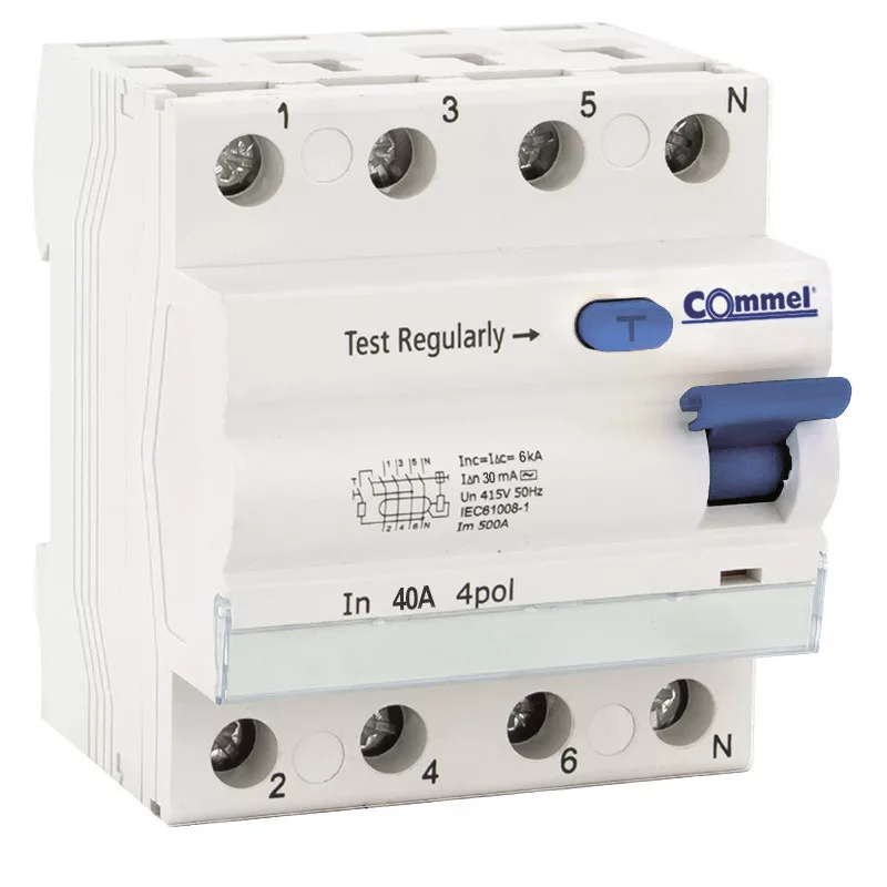 Commel áramvédő-kapcsoló ÁVK (fi-relé). A készülék előlapján lévő teszt gomb segítségével ellenőrizhető a készülék működőképessége,