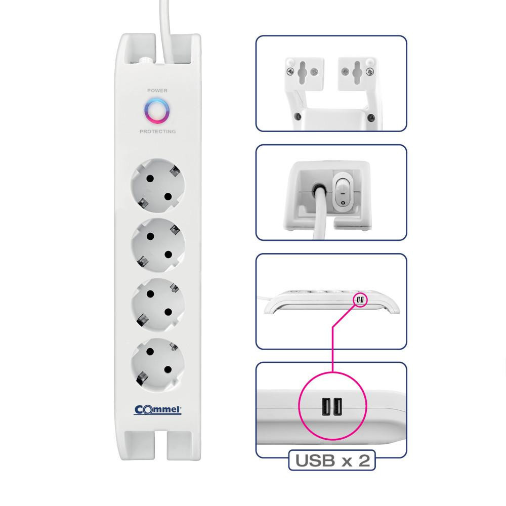 Commel elosztó, túlfeszültség elleni védelemmel, 4aljzat 2 db usb 2m, fehér, 16A, 3680W