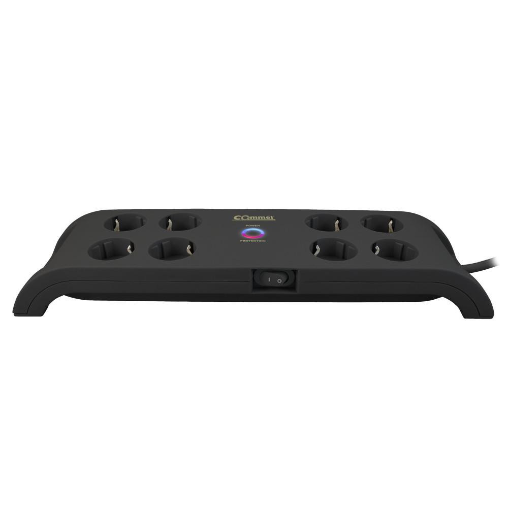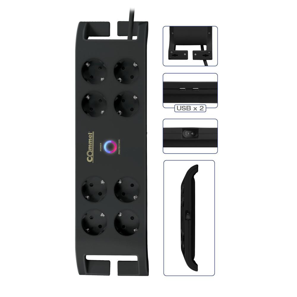Commel elosztó, túlfeszültség elleni védelemmel, 8 aljzat és 2 db USB csatlakozóval, 2m, fekete, 16A, 3680W