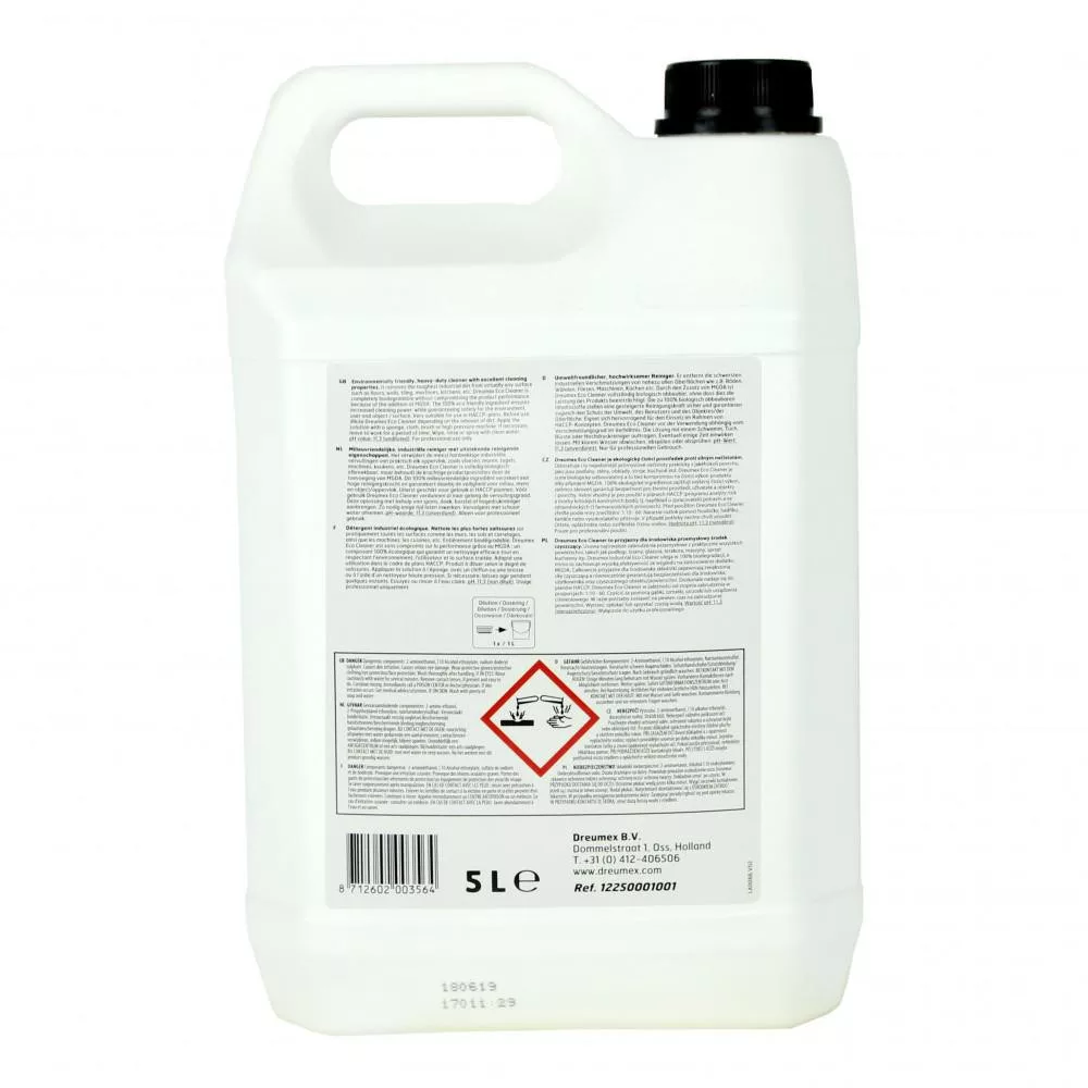 A Dreumex Eco Cleaner egy környezetbarát, erős tisztítószer. Eltávolítja a legmakacsabb ipari szennyeződéseket az olyan felületekről, mint a padlók, falak, csempék, gépek, konyhák stb. A Dreumex Eco Cleaner teljesen biológiailag lebomlik anélkül, hogy a termék teljesítményét veszélyeztetné, így garantálja a környezet, a felhasználó és a tárgy/felület biztonságát. Nagyon alkalmas HACCP tervekben való használatra.