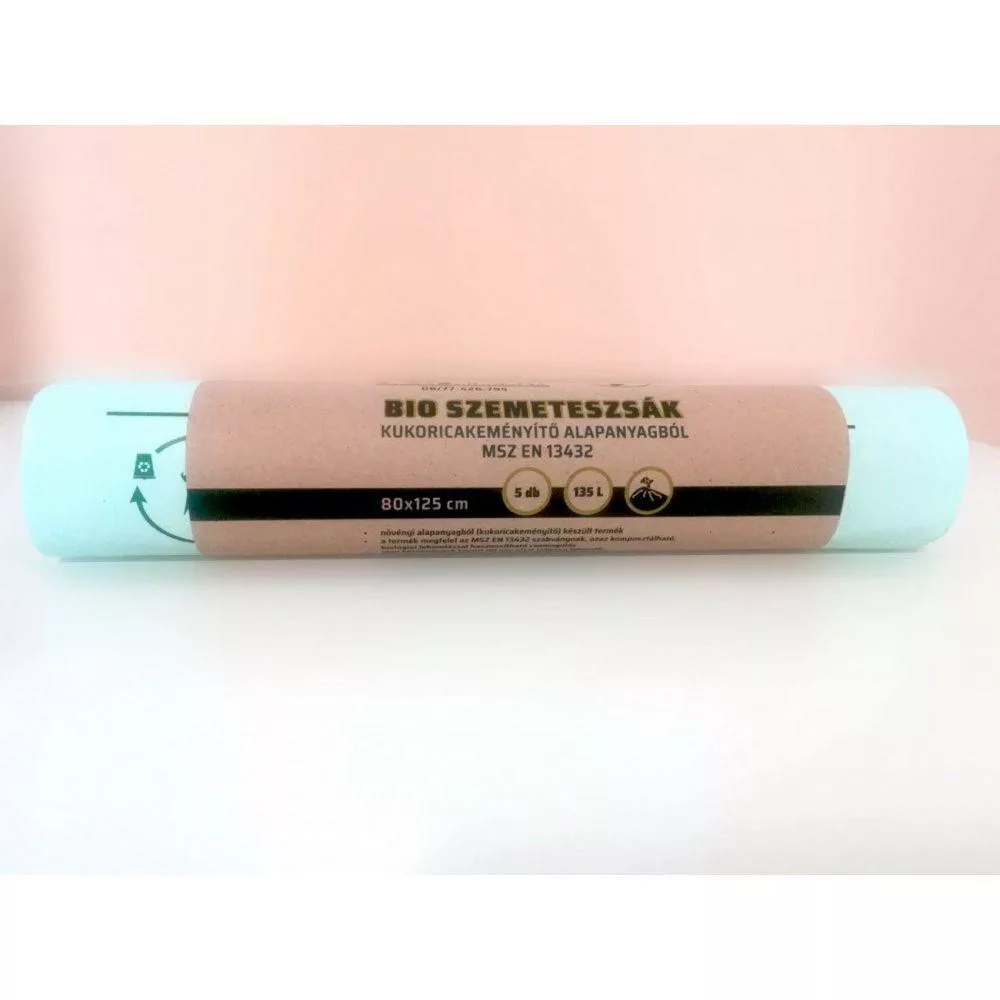 - Lebomló szemeteszsák, kukoricakeményítő alapú, PLA, 800x1250x0.03 mm, 135 literes (valós méret 200L), 5 db/tekercs