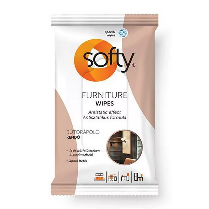 A Softy bútorápoló törlőkendő eltávolítja az ujjlenyomatokat és ragacsos szennyeződéseket, valamint a port a bútorok felületéről, miközben fokozza azok természetes fényét.