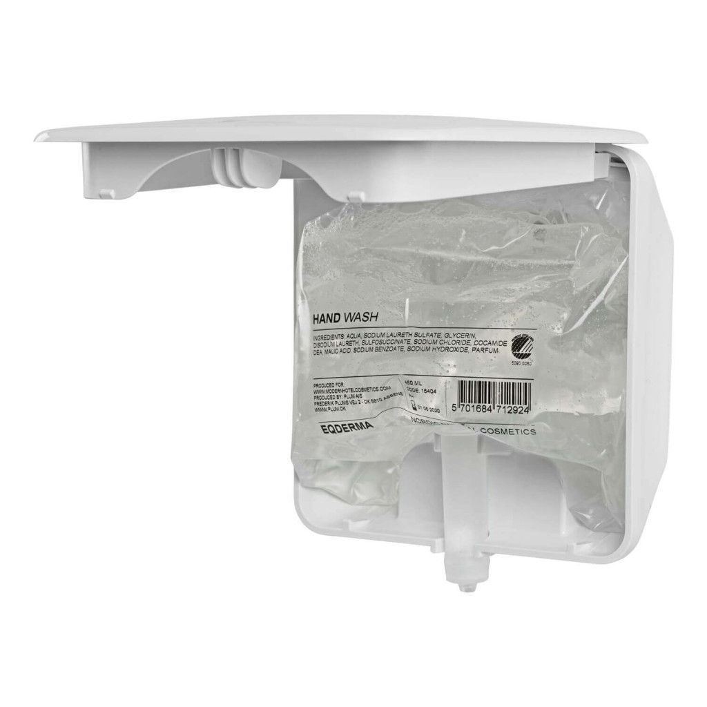 Fényes fehér szappan adagoló 450 ml Eqderma utántöltő termékhez. Az adagoló 1 előlapból és 1 hátlapból áll.